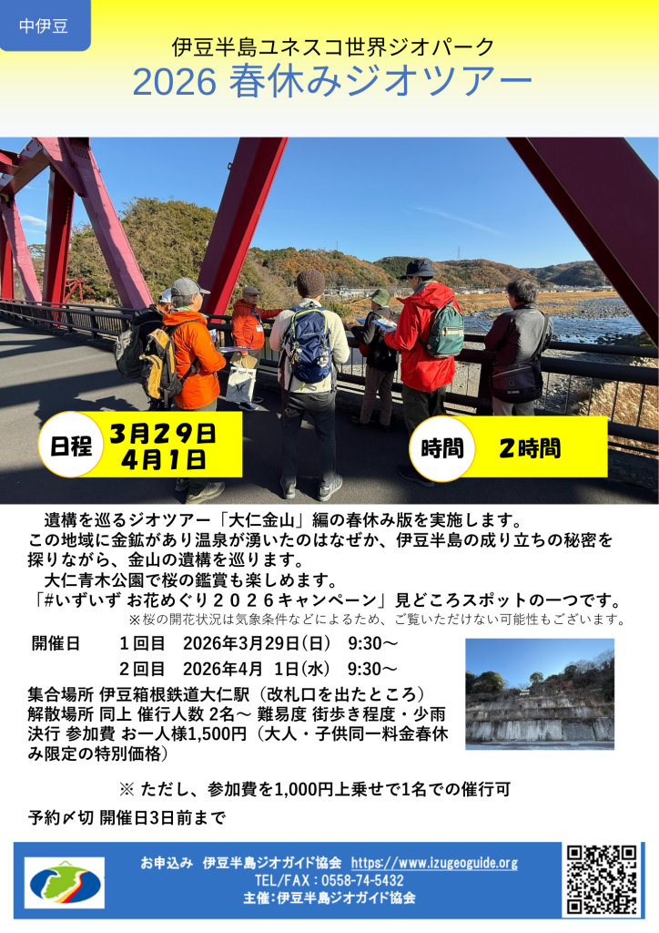 テーマや見どころ:大仁金山の遺構を巡りつつ、お花見も楽しめる春休みならではのツアーです。