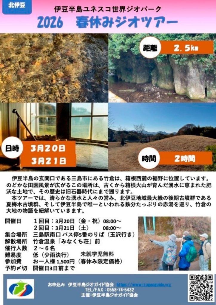 本ツアーでは、清らかな湧水と人々の営み、北伊豆地域最大級の後期古墳群である夏梅木古墳群、そして伊豆半島で唯一といわれる鉄分たっぷりの赤湯を巡り、竹倉の大地の物語を紐解いていきます。